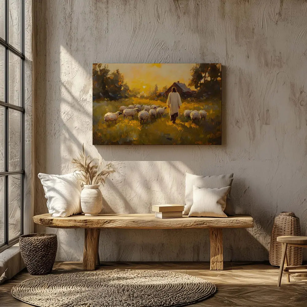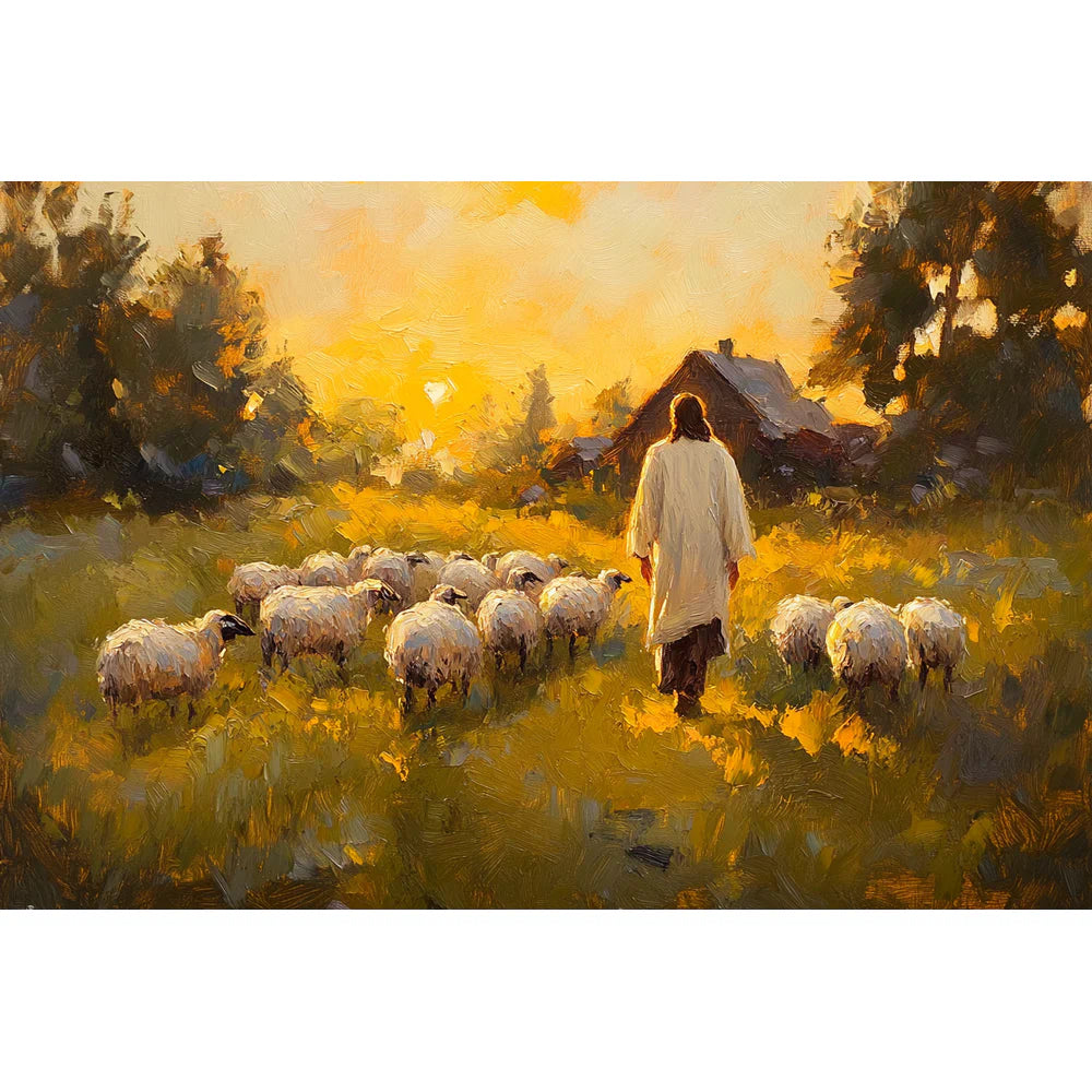 This canvas features Jesus walking alongside sheep at sunset. With rich, warm colors and realistic brushwork, it’s crafted on high-quality canvas. Perfect for adding warmth to your home, church, or prayer area. Popular scene for comfort and reflection.